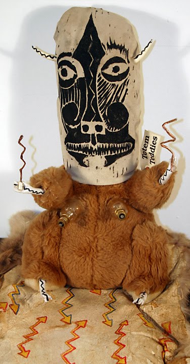 Another artist that we have observed over the last week is John Feodorov. Born of Polish and Navajo descent, Feodorov is highly influenced by his conflicting heritage and explores the idea of spirituality in his work. Much of his work takes Navajo folklore and traditions and puts a contemporary spin on it. Feodorov describes his own work as "artifacts of contemporary desperation--a search for a Something, an Other, that may or may not exist." His Totem Teddies represent this spiritual conflict. While the bear symbolizes power and dignity in many native cultures, it has been castrated of its dignity in the contemporary form of a teddy bear and has transformed into a cute and cuddly commodity. In an effort to reinstate some of its lost dignity, Feodorov instills spiritual qualities into the teddies in an attempt to regain some of their lost dignity. However, despite his attempts, the whole prospect also seems desperate and hopeless because they are still teddy bears and in that form cannot possess qualities of power and dignity.